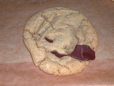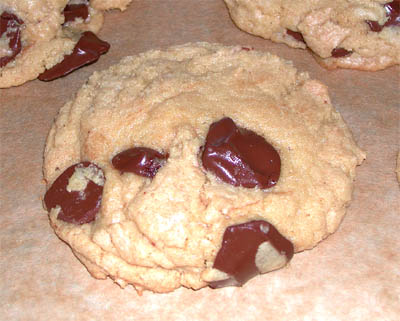 At the fifteen minute mark check the cookies. You have two choices. If they are light golden brown and slightly set around the edges while still underdone in the middle you can take them out now (see image at right or larger image at the top of the recipe.). Your other option is to take one sheet out now and bake the other sheet for 3 more minutes. After cooling taste them both and see which time you prefer. Several tastings will be needed. One at about ten minutes when they are still warm. Milk is recommended. Another at about 45 minutes as they have cooled a bit. And if any survive another tasting can be done the next day. For me the 18 minute time produced a crisper cookie that works well for bag lunches and road trips.
