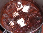 In the top of a double boiler set over hot, not simmering water, melt the chocolates with the butter, stirring frequently until smooth.