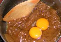 Stir in the egg and yolk, then stir in the vanilla until blended. You will wind up with a very smooth butterscotch looking and tasting concoction. No fair eating it all at this point.
