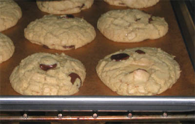 At the fifteen minute mark check the cookies. You have two choices. If they are light golden brown and slightly set around the edges while still underdone in the middle you can take them out now (see image at right or larger image at the top of the recipe.). Your other option is to take one sheet out now and bake the other sheet for 3 more minutes. After cooling taste them both and see which time you prefer. Several tastings will be needed. One at about ten minutes when they are still warm. Milk is recommended. Another at about 45 minutes as they have cooled a bit. And if any survive another tasting can be done the next day. For me the 18 minute time produced a crisper cookie that works well for bag lunches and road trips.