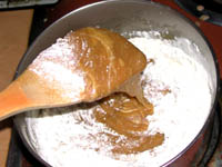 Stir the sugars into the cooled, melted butter. You can do this in the saucepan with a wooden spoon, or in a mixer. Combine well. Not all the butter will be absorbed.