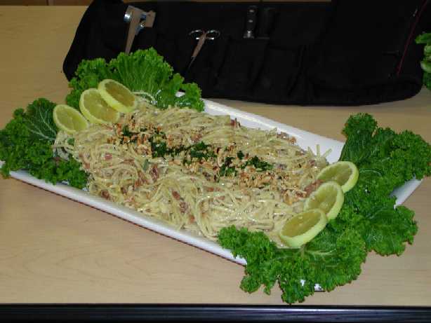 - Add drained linguine and 1/2 cup of reserved pasta water to the skillet.